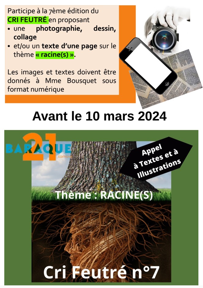Participe à la 7ème édition du CRI FEUTRÉ organisée par la MJC Baraque 21 de Castres, en proposant une image (photo, dessin, collage ...) et/ou un texte d’une page court sur le thème « racine(s) ».
